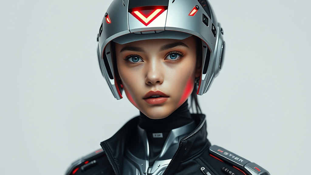 Futuristic cyborg girl sporting a mesmerizing cybernetic helmet with vibrant red LED triangles forming a radiant halo around her head, seamlessly blending with sleek, silver cybernetic features. She is dressed in a sharp black Techwear jacket, exuding a modern, functional aesthetic enhanced by subtle metallic details and an ergonomic design. Her outfit complements her advanced cybernetic enhancements, showcasing the harmonious blend of human and technology. Set against a pristine white backdrop, the contrast highlights every intricate detail of her appearance, from the soft glow of the red LEDs to the smooth, futuristic contours of her cybernetic body. Her piercing, intelligent eyes and the expressive yet composed look on her face reflect a symbiosis of human emotion and machine precision, encapsulating an advanced and forward-looking aesthetic. The overall portrayal emphasizes a seamless integration of organic and synthetic, crafting a visually captivating scene where the fusion of futuristic design and modern elements stands out brilliantly.