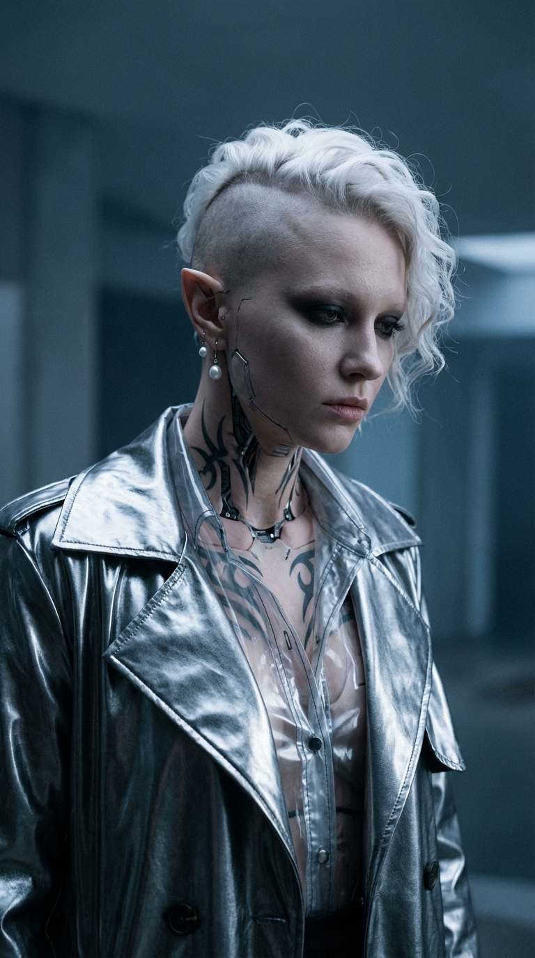 A striking portrait of a cyborg woman with pale skin, dark tribal tattoos, and pointed ears, wearing a shiny silver trench coat. Her white, wavy hair and dark eye makeup contribute to a moody, ethereal atmosphere. The image has a cinematic quality with muted cool colors.