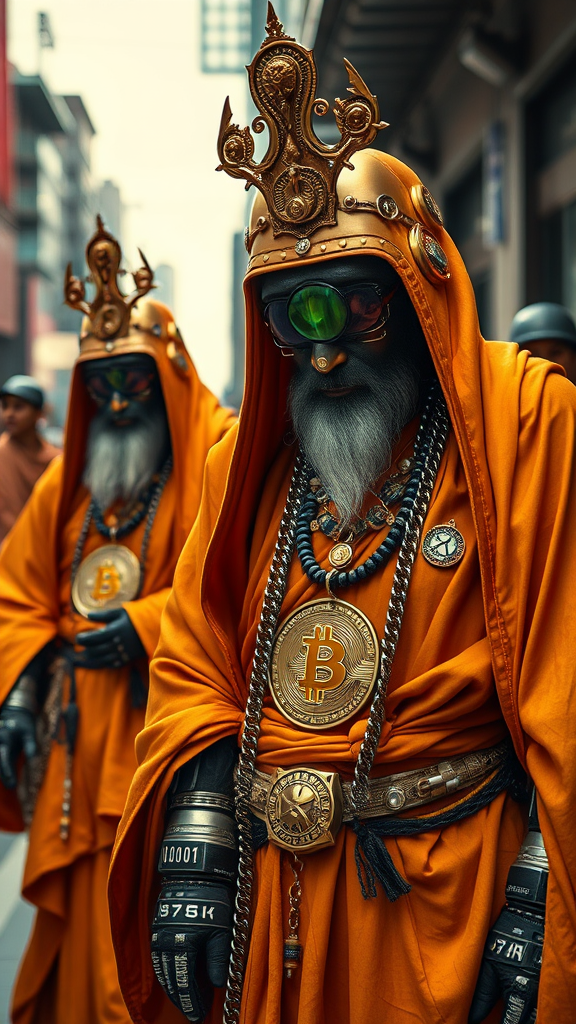 Futuristic cypherpunk monks embracing digital mysticism, adorned in bitcoin-inspired streetwear with intricate cyber-embellishments, showcasing a unique fusion of spiritual and technological elements in photorealistic detail, capturing a harmonious blend of tradition and innovation in a vivid urban setting.