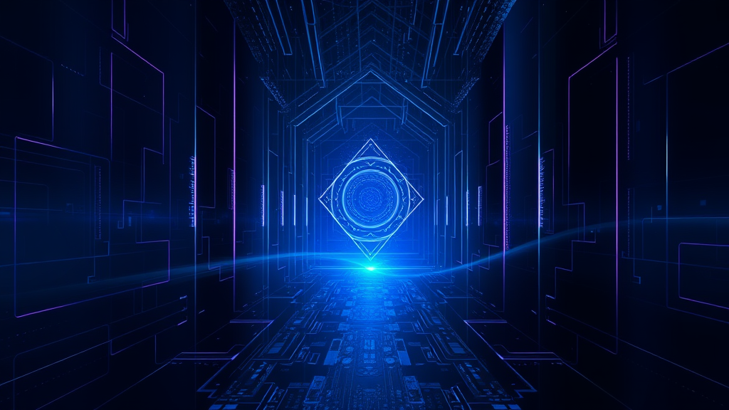Futuristic dark ambient album cover design featuring abstract geometric patterns and ethereal light trails in deep blues and purples; evokes a sense of mystery and introspection, drawing the viewer into a realm of immersive electronic soundscapes.