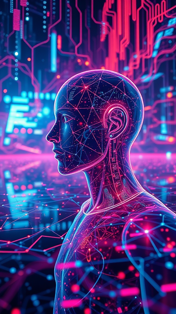 Futuristic digital art depicting a holographic humanoid in a mesmerizing digital landscape, intertwined with vibrant sound waves and complex neural networks. The scene reflects an intricate tapestry of big data and high technology, captured as a professional, high-quality photograph in stunning 32k UHD resolution. The masterpiece features a close-up view, showcasing the intricate details and reflections within this immersive, cutting-edge world.