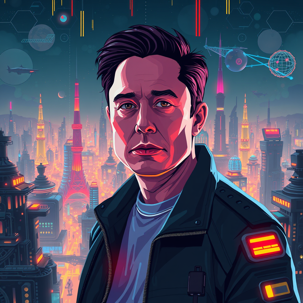 Futuristic digital art depicting Elon Musk in a cyberpunk landscape, rendered in vibrant SAI pixel art style, with neon accents illuminating the scene, capturing the essence of technological innovation and visionary ambition amidst a sprawling network of interconnected cityscapes and advanced machinery.