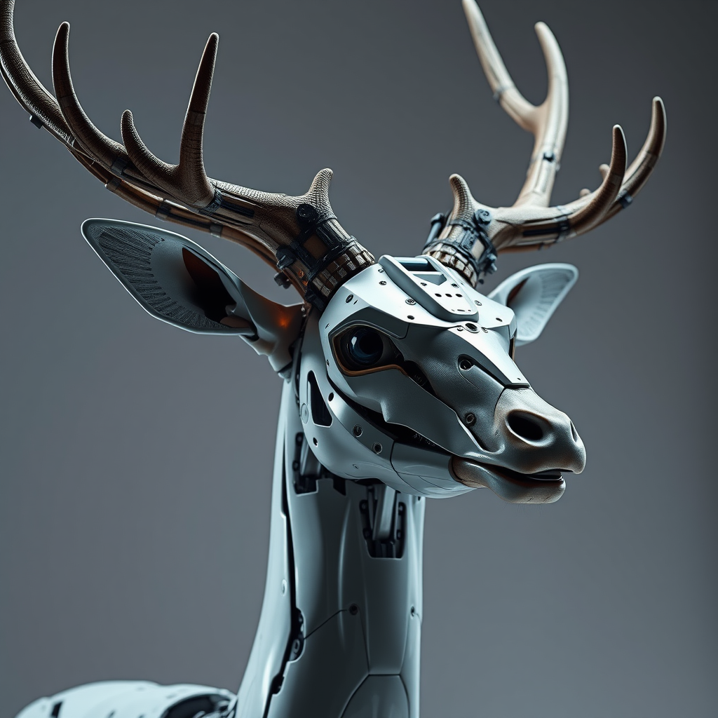 Futuristic digital artwork of a robotic deer head adorned with intricate cybernetics, as if designed by the imaginative minds of James Paick and Roger Dean, exuding an aura of menace. The cybernetic elements resemble rolled-up sleeves, photographed with the precision of an 800mm lens under dramatic studio lighting. A harmonious blend of realism and photorealism captures the deer in a modern yet ordinary setting, balancing the rustic and organic with a touch of historical and traditional influences, resulting in an image that is both simplistic and intriguingly complex.