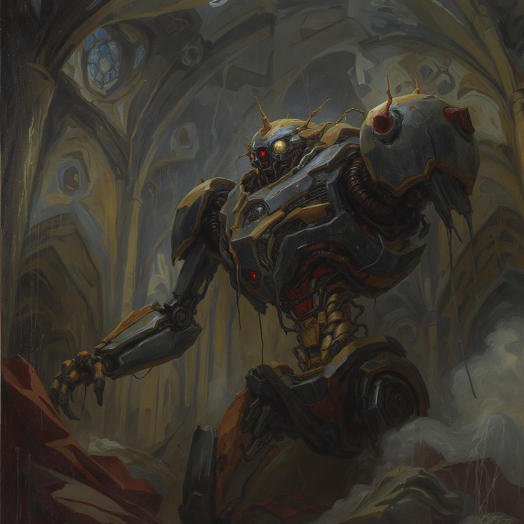 Futuristic drone-inspired robot MACHINE BUMPER with a sci-fi twist, whole body captured in a cinematic composition, featuring intense lighting and dramatic color grading. The setting is a distorted and abstract depiction of a poorly drawn cathedral, with the robot appearing mutated, deformed, and disfigured. The design carries a unique barocco influence combined with elements reminiscent of Manet's style, presenting an ugly yet intriguing aesthetic. The robot's anatomy is purposefully distorted and blurry, creating a grotesque, cartoonish, and abstract appearance with an emphasis on worst-quality features to evoke a sense of unease and fascination.