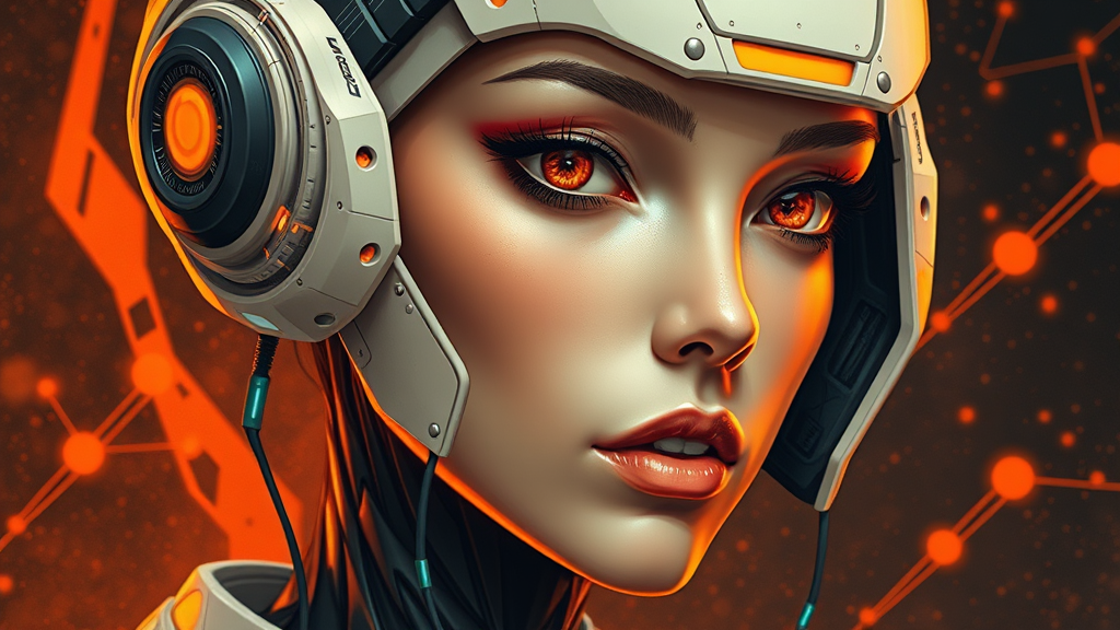 Futuristic fantasy illustration featuring an exquisite android, capturing a realistic hyper-detailed portrait style, blending dark ivory and vibrant orange hues, evoking the elegance of classic portraiture with accents in deep gold and teal. The artwork emphasizes intricate realism with clear, sharp lines, portraying technological wonders with a visionary flair --ar 68:128 --stylize 750 --v 5.2.