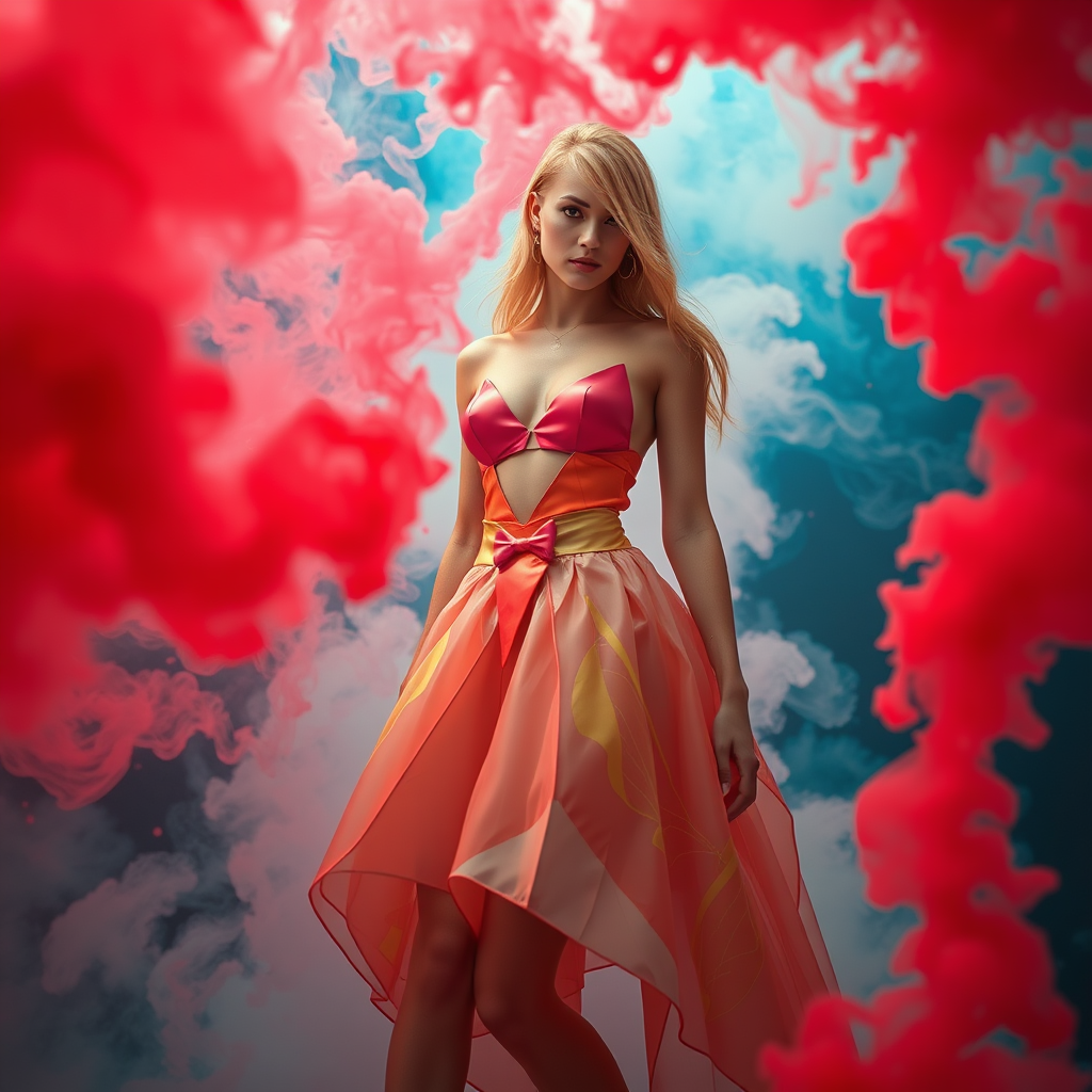 Futuristic fashion photography featuring a blonde female wearing a cosmic-inspired skirt; incorporates bold geometric shapes and striking angles. The scene is enveloped in grotesque red smoke, with hypermaximalist style elements. The composition is colorful and intricately detailed, presenting a high-concept photoshoot. The atmosphere remains elegant and super detailed with pastel hues throughout, with a focus on innovative lighting effects to enhance the visual impact.