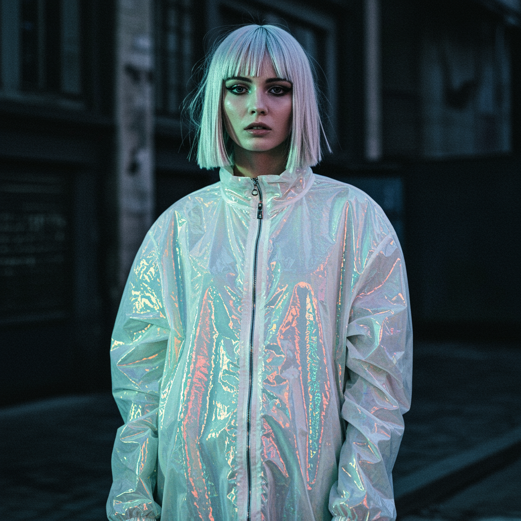 futuristic fashion shoot, female model, silver metallic hair, oversized white iridescent streetstyle outfit, rebellious, avant-garde, vibrant dynamic lighting, shot on Agfa Vista 200 film, urban setting, edgy, bold textures, high-contrast colors, expressive poses, --ar 9:16 --q 2