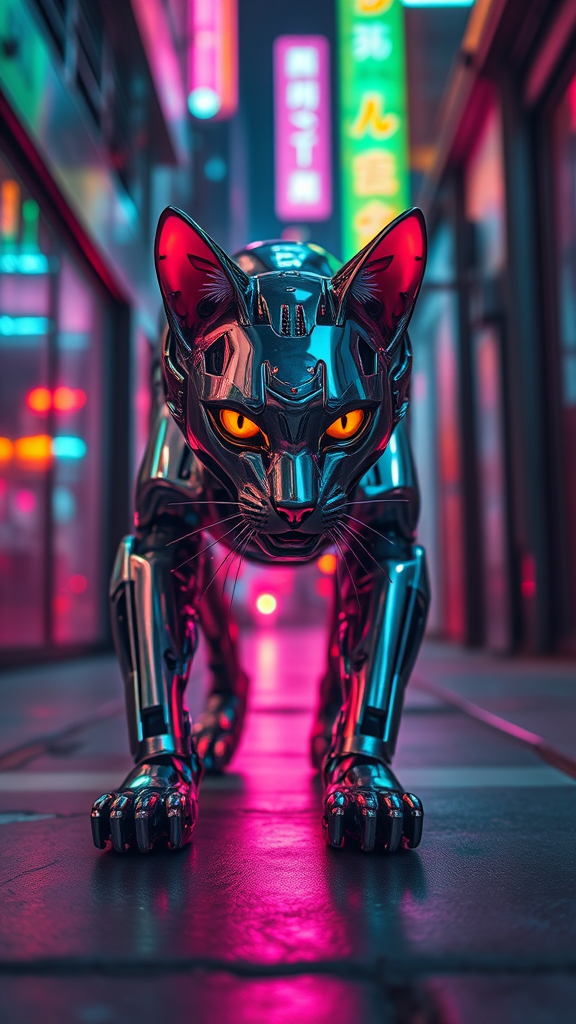 Futuristic feline automaton prowling neon-lit alleys, its metallic frame reflecting vibrant colors as synthetic whiskers twitch in the digital night.