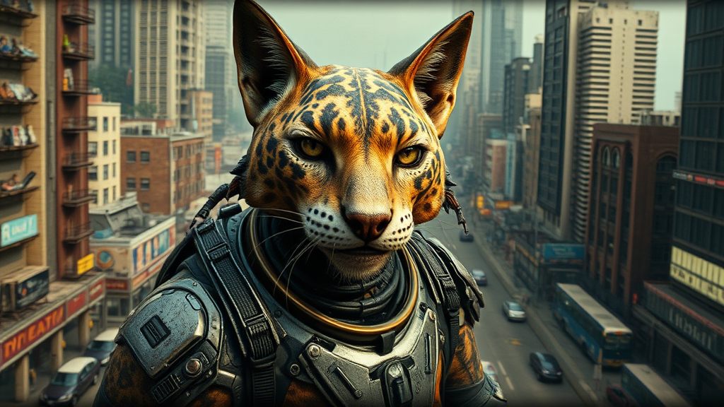 Futuristic feline humanoid, directed by Neill Blomkamp, gritty urban landscape, reminiscent of District 9, shot in expansive Cinemascope, blending sci-fi realism with anthropomorphic fantasy, detailed textures, immersive cityscape, emotion-driven narrative.