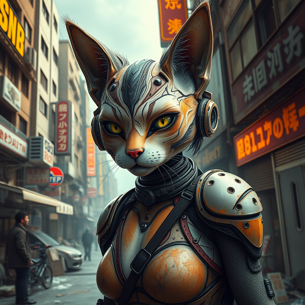Futuristic feline humanoid, inspired by Neill Blomkamp's gritty sci-fi style, set in a world akin to District 9, captured in the widescreen expanse of Cinemascope, blending urban decay with advanced alien technology, where the nekogirl navigates a tension-filled society on the brink of change.