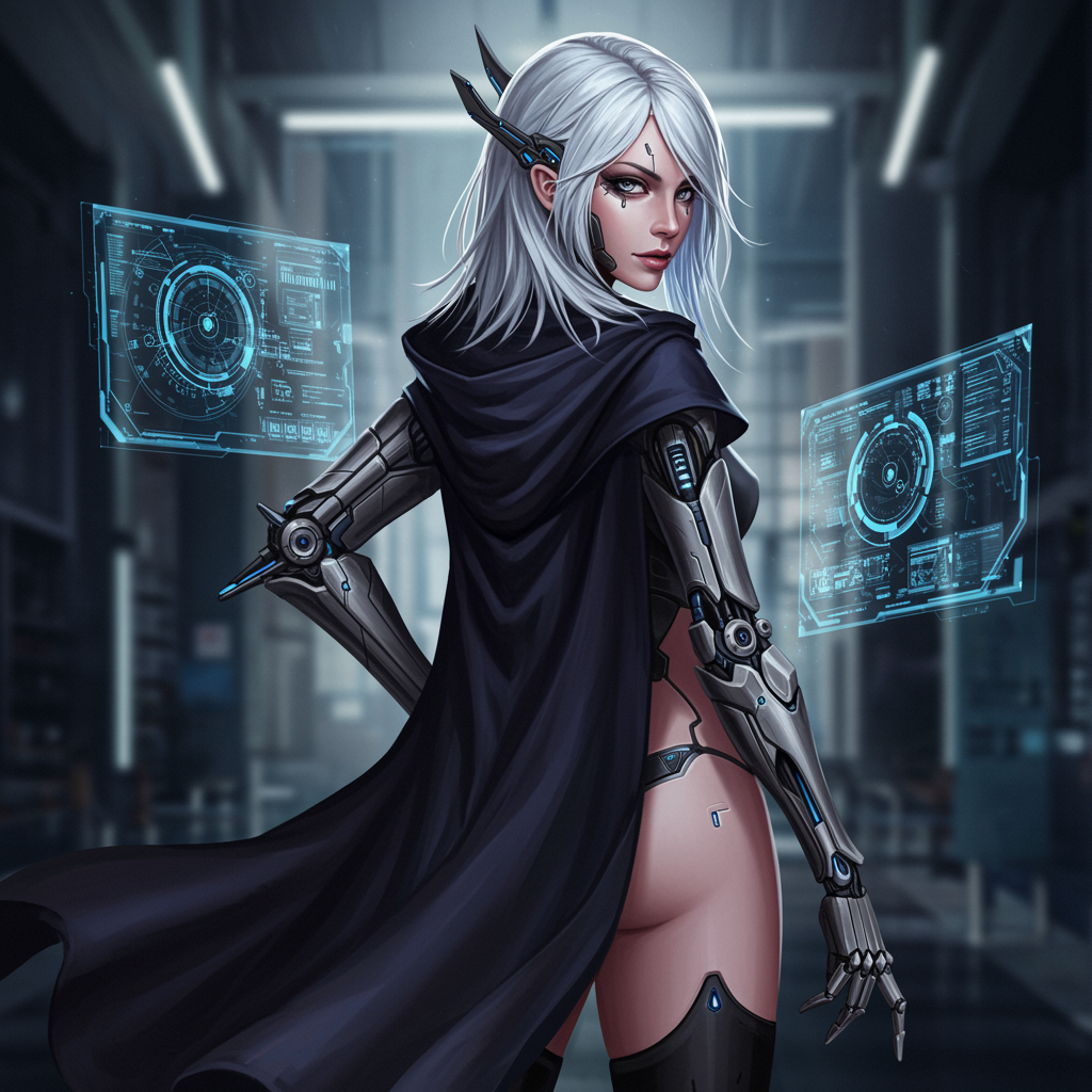 futuristic female android with intricate mechanical arms, sleek machinery, advanced prosthesis, shimmering silver hair cascading down, dark cloak flowing elegantly, gazing intently at the observer from behind, gracefully curvy physique, one hand confidently placed on her hip, poised amidst a backdrop of advanced technology.