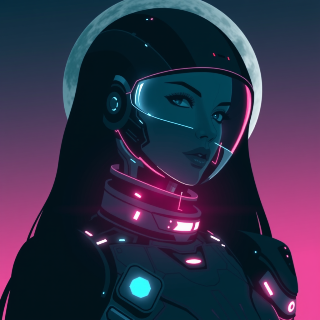 Futuristic female cyborg in black silhouette, intricately detailed vector design, resembling a majestic moon knight; stunning android woman in a sci-fi movie poster style, donned in an advanced space suit; captivating cyberpunk art with neon accents and a sleek, otherworldly atmosphere.