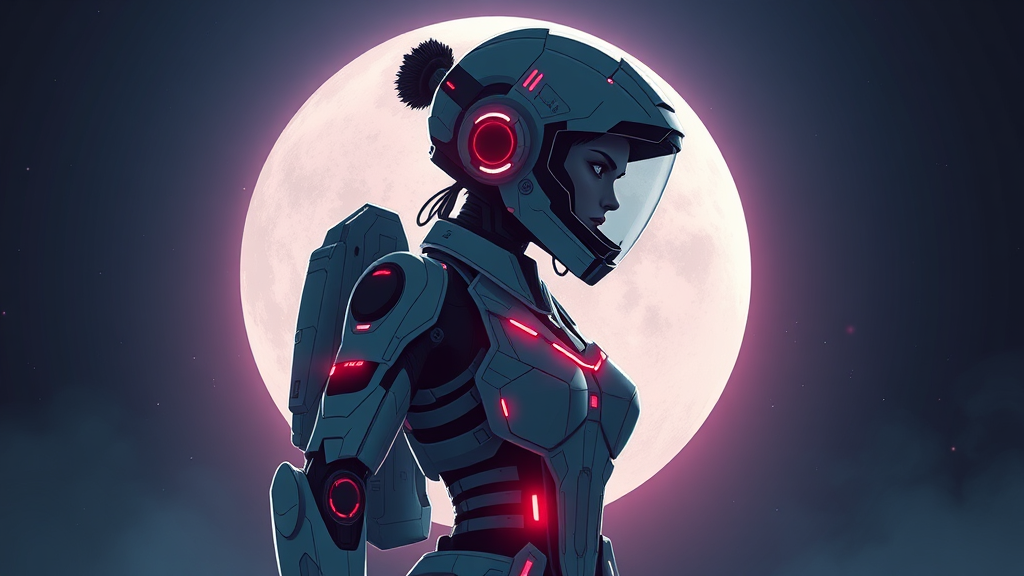 futuristic female cyborg silhouette, detailed vector style, ethereal moonlit knight appearance, stunning android lady, sci-fi film poster vibe, astronaut-esque attire, cyberpunk art with neon accents