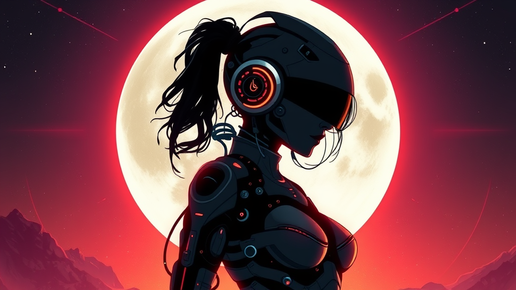 Futuristic female cyborg silhouette, intricately detailed vector illustration, elegant moonlit warrior woman, stunning android character, sci-fi cinema poster style, figure in advanced space attire, neon-lit cyberpunk aesthetic.