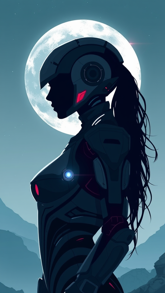 futuristic female cyborg silhouette, intricately detailed vector design, elegant moonlit warrior, stunning android figure, sci-fi cinematic poster, individual clad in sleek space armor, cyberpunk inspired art style.