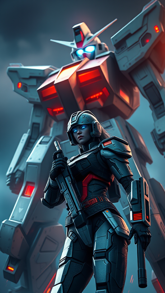 futuristic female soldier, towering mech, Gundam influence, dramatic cinematic poster scene, immersive lighting, highly detailed 8K CG wallpaper quality, physics-based rendering realism, striking contrast, photographic hyperrealism, vibrant and rich color palette, intense visual depth and texture