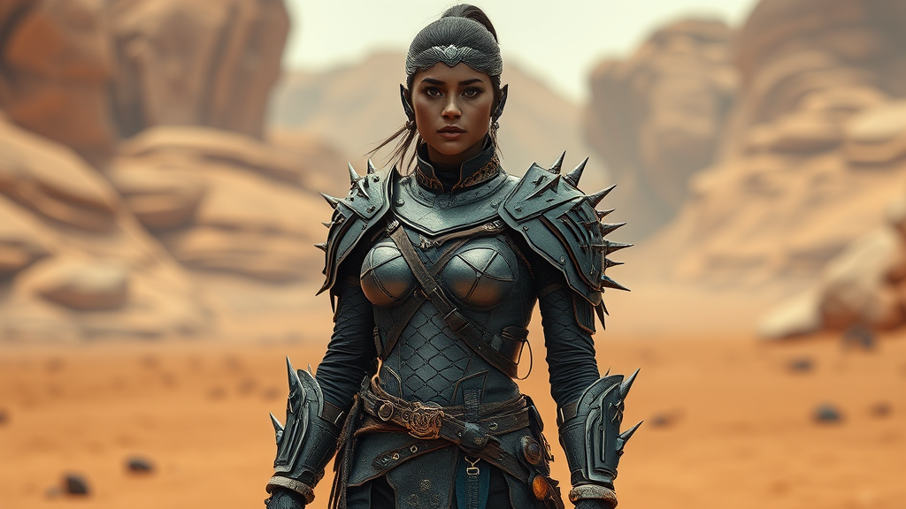 Futuristic female warrior in dark silver and bronze armor, standing on a desert landscape reminiscent of a Mars-like planet. Her attire features random ravel-like textures and sharp, prickly details, embodying the scoutcore aesthetic. Inspired by the artistic style of dau al set, the design blends elements of realistic depiction with a focus on leather and hide materials. Her presence is both commanding and enigmatic, set against the stark, otherworldly backdrop of the alien desert terrain.