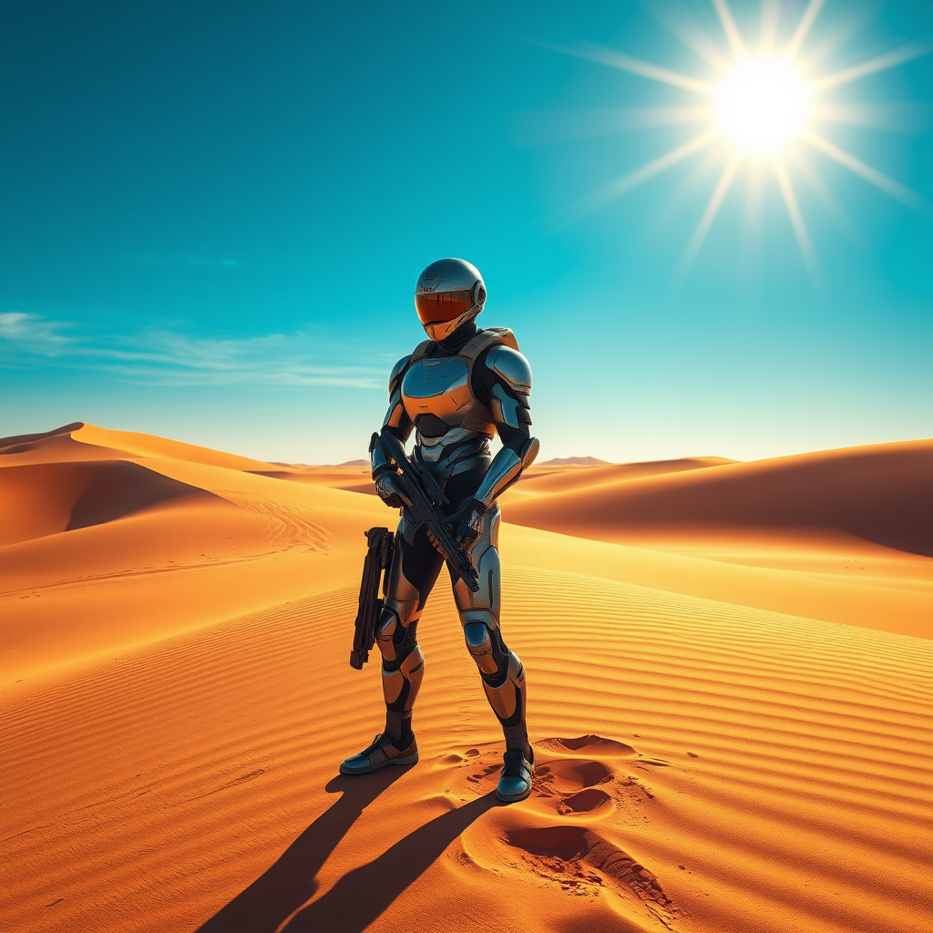 Futuristic figure clad in a sleek, tactical suit stands poised in a vibrant desert landscape under an intense azure sky. Dramatic shadows cast by the brilliant sun enhance his dynamic pose, with a gun held firmly at his side. His helmet gleams with reflective surfaces, capturing the surrounding scenery. Evocative of a Charles Fremont Conner piece, the scene exudes a concept art style characterized by high detail and cinematic flair. Stark contrasts define the vast sand dunes, peppered with unique sci-fi elements. The ultra-detailed environment envisions an antipodean future, highlighting themes of strength and resilience.
