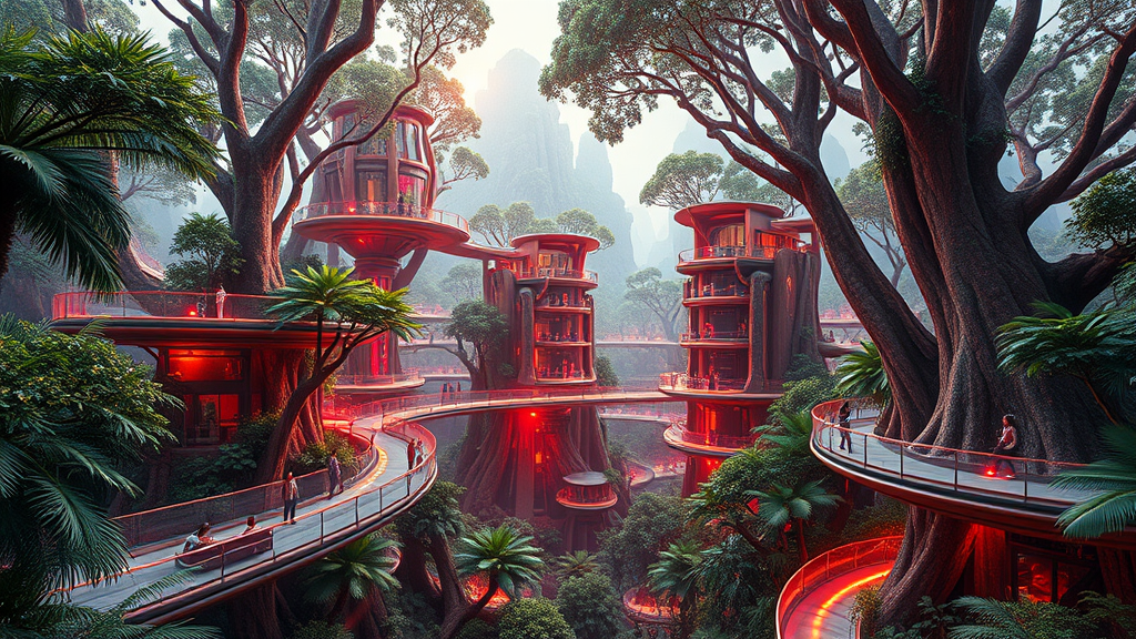 Futuristic forest city wide shot featuring interconnected glass walkways weaving through sustainable architecture structures nestled within massive trees of a lush tropical biome, rendered with a redshift aesthetic reminiscent of Syd Mead's visionary style. Medium angle shot captures a futuristic treehouse metropolis where brutalist buildings harmoniously integrate with the vibrant flora. People are seen sitting, standing, and walking around the complex, echoing John Harris's concept watercolor approach. The city of the future is depicted in a hyperrealistic manner, bursting with color and intricate detail, highlighted by bold, contrasting lighting, conveyed in an aspect ratio of 16:9.