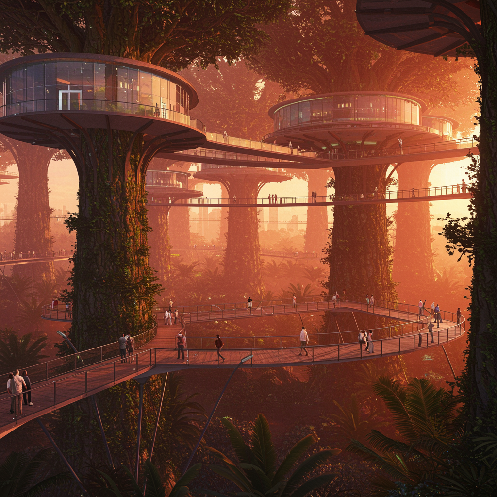 Futuristic forest city with interconnected glass walkways, sustainable architecture structures nested within massive trees, tropical biome, rendered in redshift style reminiscent of Syd Mead. Medium shot of a treehouse metropolis featuring brutalist buildings seamlessly integrated into the foliage, populated by people engaging with their surroundings, concept inspired by John Harris' watercolor technique. A hyperrealistic, colorful cityscape of the future, showcasing intricate detail and dramatic contrast lighting.