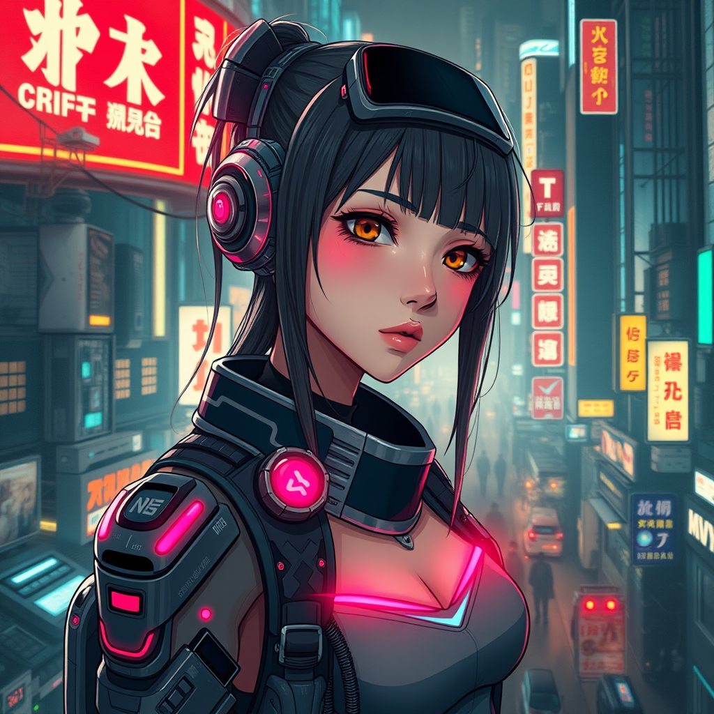 Futuristic girl, electronic design, anime-inspired character, techno-noir ambiance, digital artwork, retro-futurism, pan-futurism vision, cyberpunk dystopia, neon-lit cityscape, gritty and dark, advanced technology, street art influence, cutting-edge gadgets, cinematic feel, detailed metropolis, moody illumination, ultra-detailed urban environment, cybernetic enhancements, augmented reality features.
