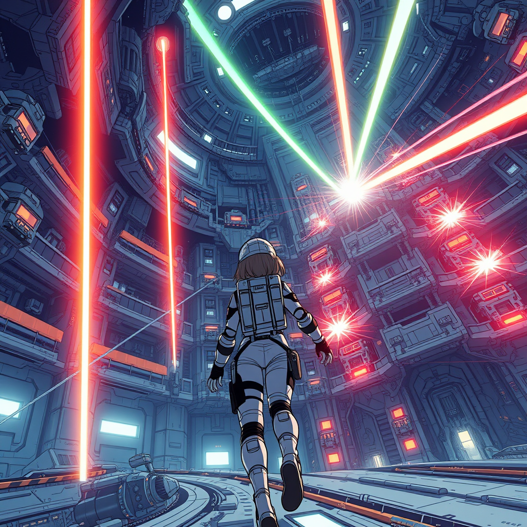 Futuristic girl in a detailed spacesuit exploring the interior of a massive spaceship, reminiscent of Tsutomu Nihei's style, influenced by Sidonia no Kishi. The setting is characterized by expansive multi-story spaces emphasizing gigantism, intricately designed with hyper-detailed sci-fi elements. A prominent laser generator takes center stage, with beams originating from the sky, interacting with dynamic energy clots. The scene conveys movement, with speed and acceleration captured in light flashes, embodying anime aesthetics. Illustrated in high-definition, super-resolution 8K, the manga graphics create a first-person perspective, immersing the viewer in the richly detailed and imaginative environment.