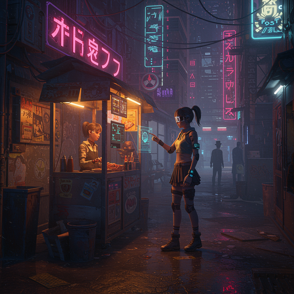 Futuristic girl interacting with a high-tech food vendor in a neon-lit urban environment, showcasing a sleek, electronic design with manga-inspired features. Set in a techno-noir world, the scene blends animated drawing with vintage futurism, highlighting a dystopian cyberpunk aesthetic. The cityscape is a detailed panorama of dark, gritty streets adorned with graffiti and illuminated by moody, cinematic lighting. The atmosphere is infused with high-tech elements, including advanced gadgets and urban architecture. The girl, equipped with sophisticated implants and utilizing augmented reality interfaces, embodies the essence of a hyper-detailed, pan-futuristic city.