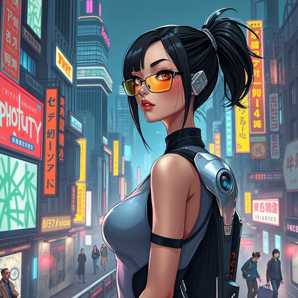 Futuristic girl, sleek design, digital artwork, manga-inspired character, techno-noir essence, animated illustration, retro futurism touch, pan-modernism, cyberpunk dystopia, neon-lit metropolis, gritty and dark atmosphere, advanced technology, graffiti elements, futuristic devices, cinematic flair, intricate cityscape, atmospheric lighting, hyper-detailed urban environment, high-tech enhancements, augmented reality elements.