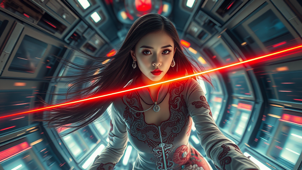 Futuristic girl with sleek cyberpunk prosthetics, adorned in a modernized traditional Chinese dress, her long hair flowing in zero gravity within a high-tech spaceship. The environment radiates a sci-fi aura as hyper-detailed elements create a photorealistic atmosphere. A central beam of laser light pierces the setting, connecting to an external laser shooting from the cosmos, surrounded by swirling energy clots. Enhanced in cinematic style, the scene depicts acceleration and speed with vivid light flashes, capturing the essence of dynamic movement. Presented in super resolution, the 8K hyper-realism brings every intricate detail to life, reminiscent of a long exposure painting.