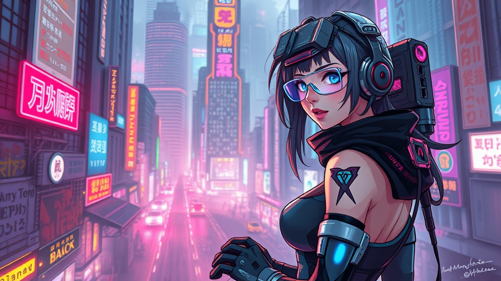 Futuristic heroine, cutting-edge design, digital illustration, anime-inspired character, tech-noir vibe, stylized animation, retro-futuristic flair, global futurism, dystopian neon cityscape, vibrant neon glow, gritty and dark atmosphere, advanced technology, urban graffiti, sci-fi gadgets, cinematic storytelling, intricate metropolis backdrop, atmospheric lighting, hyper-detailed urban setting, advanced cybernetic enhancements, immersive augmented reality experience.