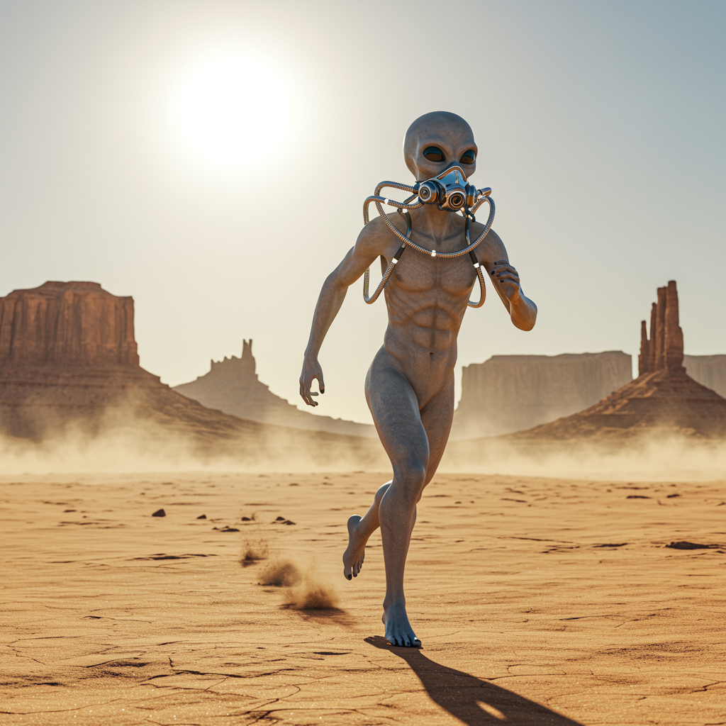 View this AI-generated image featuring futuristic humanoid alien sprinting across a barren desert landscape wearing a high tech breathing apparatus. Created using advanced AI technology, this image showcases landscapes. Perfect for creative projects, digital art, inspiration.