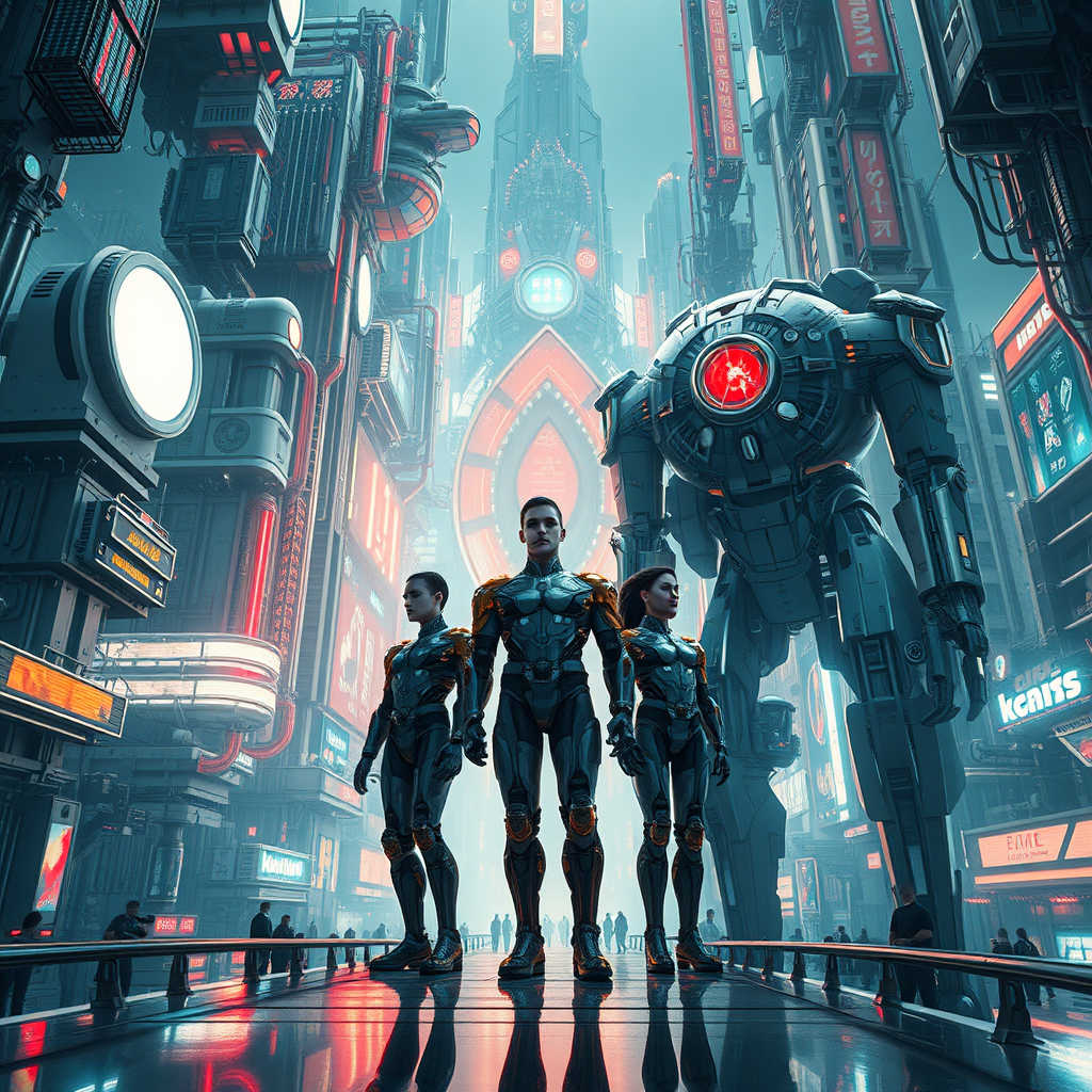 Futuristic individuals positioned amidst a colossal sci-fi robotic cyborg metropolis, featuring complex mechanical and futuristic elements, incredible detailing, hyper-realistic imagery, cinematic atmosphere, dynamic composition, and high contrast, with a slight shift focusing on the interplay of light and shadow across gleaming metallic structures and vibrant neon accents.