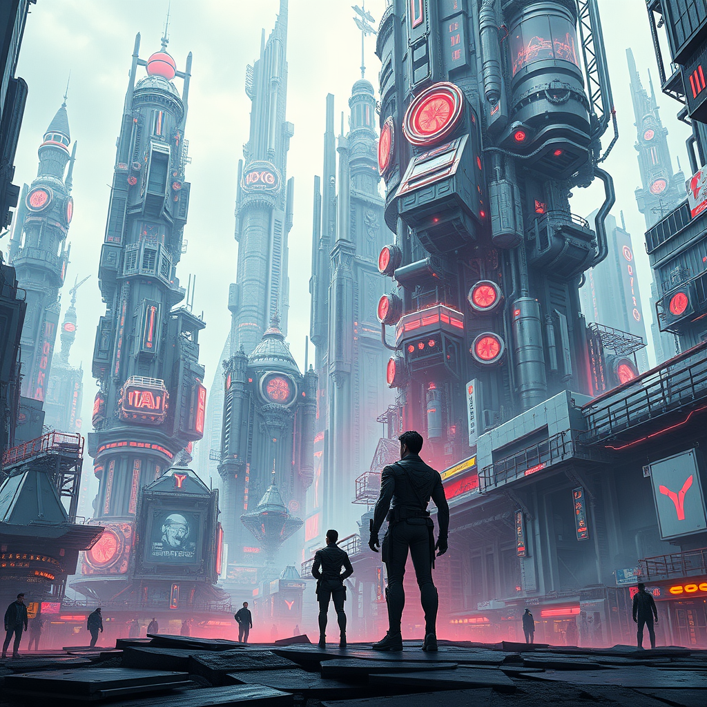 Futuristic individuals stand amidst a sprawling, enormous cybernetic metropolis, enveloped by towering mechano-cybernetic architecture adorned with intricate technological and sci-fi embellishments, boasting an extraordinary level of detail, hyper-realistic and cinematic with a balanced composition, and striking high contrast, as energy pulses through the vibrant cityscape.