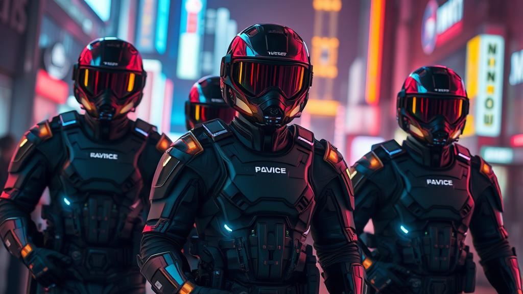Futuristic law enforcement clad in sleek cybernetic black armor patrolling a neon-drenched cyberpunk metropolis, sporting advanced modern exosuits with neon accents that mirror ambient glow, showcasing complex design with meticulous attention to detail. Bathed in atmospheric and dramatic lighting, the scene is rendered with photorealistic quality, reminiscent of cinematic visuals captured in ultra-high definition 8K resolution. Utilizing cutting-edge technology like Unreal Engine and Octane Render, the setting employs immersive depth of field to emphasize the intricate textures and reflections on the armor.