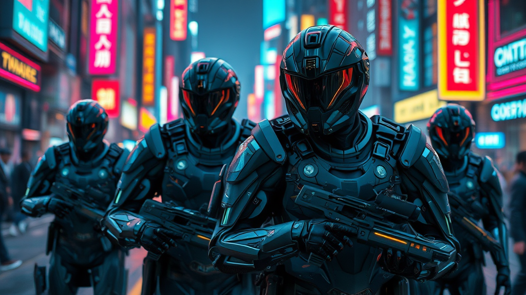 Futuristic law enforcement in sleek cybernetic obsidian armor patrolling a vibrant cyberpunk metropolis, advanced exosuit technology, glowing neon accents, immersive reflection mapping, highly detailed and intricate design, moody dramatic lighting, hyper-realistic visuals, cinematic scope, ultra-high definition 8k, utilizing unreal engine and octane render, artfully crafted depth of field, portrait aspect ratio 9:16, version 5 aesthetic.