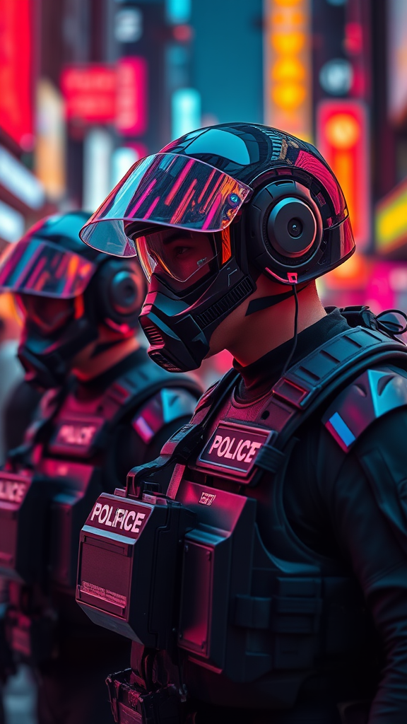 Futuristic law enforcement officers patrol the neon-drenched cyberpunk city streets, clad in sleek, lightweight yet heavily fortified riot gear. Their advanced helmets boast intricate details and state-of-the-art technology, reflecting a cascade of vibrant neon lights. The scene is captured with dramatic, cinematic lighting, highlighting the photorealistic depth and sharpness. This high-definition, 8k imagery is brought to life with a shallow depth of field, creating a striking visual narrative resembling an unreal engine or octane render environment, set in a towering 9:16 aspect ratio cityscape.