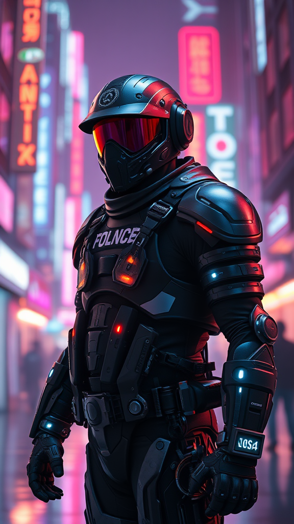Futuristic law enforcer clad in cybernetic obsidian armor stands vigilant in a neon-lit cyberpunk metropolis, adorned with sleek, modern exosuit enhancements. The vibrant glow of neon reflections dance across the intricate and meticulously detailed suit, casting dynamic lighting that enhances the scene's drama. The environment is rendered with photorealistic precision, reminiscent of high-definition cinematic visuals. The image boasts 8k resolution, crafted with the prowess of unreal engine and octane rendering, capturing a profound depth of field that emphasizes the intricate interplay between light and shadow in this futuristic setting, all within a 9:16 aspect ratio.