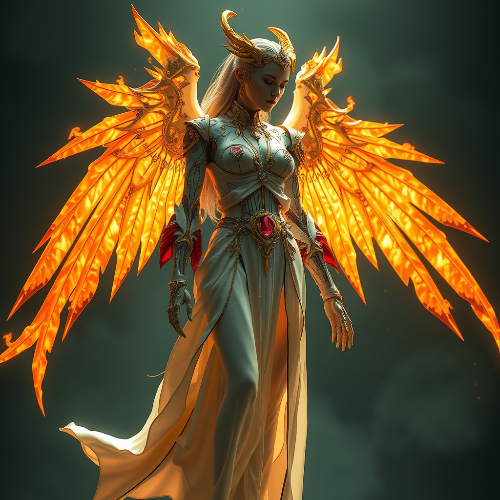 Futuristic Lovecraft-inspired robotic angelic woman with an ethereal presence, adorned with elegant fire wings, gracefully hovering in mid-air. She wears a flowing alabaster robe with vivid crimson details, flickering flames subtly emanating from beneath her attire. Designed with meticulous attention to detail, her body displays intricate jewelry crafted from gold and inlaid with sparkling rubies and other dazzling gemstones. Enveloped in mesmerizing volumetric lighting, the scene exudes a cinematic aura with ultra-realistic, ornate designs. The character embodies a fusion of complexity and otherworldly beauty, captivating with her exquisite craftsmanship and elaborate motifs, set within an elongated vertical composition to emphasize her celestial nature.