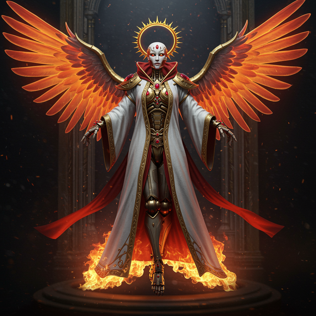 Futuristic Lovecraftian female robot angel with fiery wings gracefully floating, adorned in a flowing white robe with striking red accents, flames flickering beneath the hem. The character design is full-body, showcasing intricate gold and gemstone jewelry, with rubies prominently featured. The setting is bathed in volumetric lighting, offering a cinematic, ultra-realistic portrayal. The overall look is ornate and richly detailed, blending elements of otherworldly beauty with a sense of cosmic mystery.