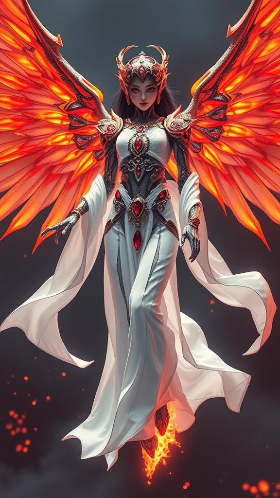 Futuristic, Lovecraftian female robotic angel adorned with fiery wings, gracefully levitating, wearing a flowing white robe enhanced with vivid red accents. Flames flicker beneath her robe, and she's embellished with intricate jewelry and gemstones, prominently featuring rubies set in gold. The design is captured in full body, showcasing exquisite detail, volumetric lighting, and a cinematic, ultra-realistic style. The scene features an ornate and intricate aesthetic, lending an ethereal yet eerie quality to the character. The atmosphere is one of balanced chaos and surreal beauty, encapsulated in a dramatic, elongated vertical composition.