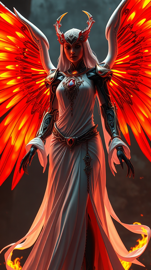 Futuristic Lovecraftian woman robot angel with vivid fire wings, hovering gracefully in a flowing white robe with striking red accents, flames subtly flickering beneath the robe. Her design captures the essence of character aesthetics with intricate jewelry adorned with rubies and gold. The figure is bathed in volumetric lighting, casting cinematic shadows, while the intricate and ornate details emphasize ultra-realistic textures, capturing both mechanical and ethereal qualities. Her presence is both mystical and commanding, with a harmonious blend of elegance and otherworldly intrigue.