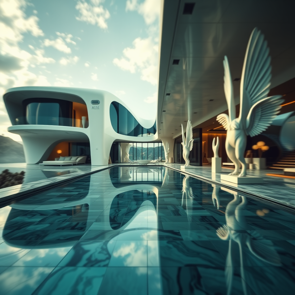 Futuristic luxury home, sleek architecture, blurred elements, abstract forms, elongated fingers, distorted hands, artistic tiling, unique sculptures, winged shadows, iconic statues, expansive landscape.