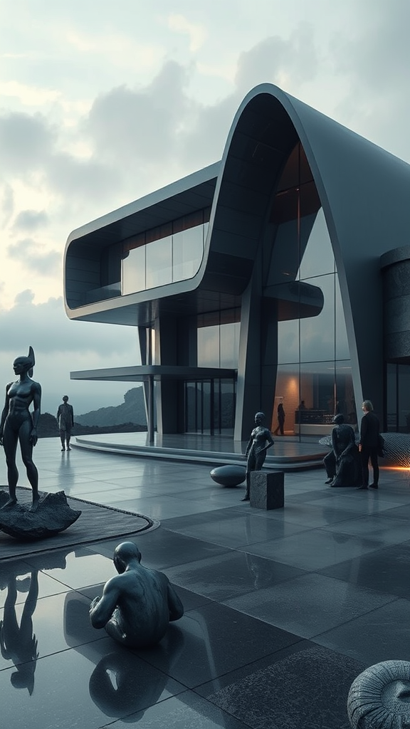 Futuristic luxury home with sleek, avant-garde architecture, set against a blurred, dreamlike landscape. Abstract sculptures and shadowy forms populate the scene, with hints of disfigured and mutated art pieces. The structure is a harmonious blend of glossy surfaces and translucent panels, appearing almost as if with wings. Subtle mist and hazy tiles add an ethereal quality, while the residence itself feels like a statue poised in time, reflecting both innovation and an enigmatic nature.