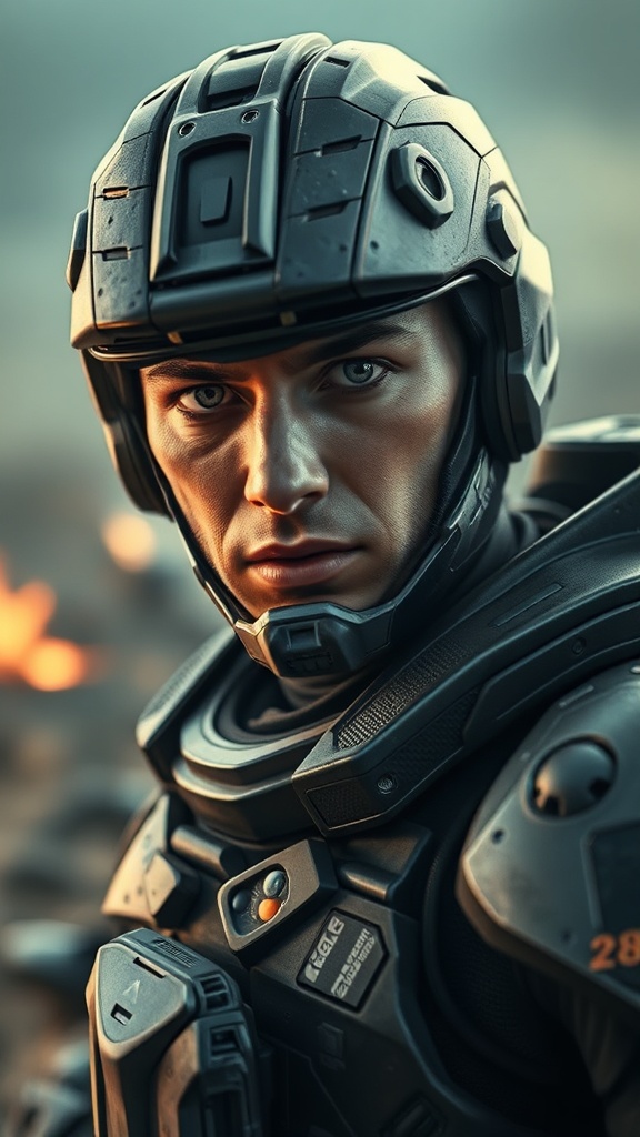 Futuristic marine in combat armor, intense gaze, apocalyptic battlefield backdrop, engaging the viewer, lifelike portrait capturing detailed skin, realistic, photo-realistic, 8k resolution, high detail, full-length framing, rich color tones in high detail, soft and diffused lighting, shallow depth of field, sharp focus, hyperrealistic style, cinematic CGI lighting, 3D rendering. Avoid elements of low resolution, text distractions, errors, poor-quality attributes, duplicates, and undesirable distortions like extra or mutated body parts, blurred or ill-proportioned anatomy, unnecessarily extended limbs, or any form of visual defects that detract from the realism. Ensure clarity and excellence without superfluous elements like usernames, watermarks, or non-essential text.