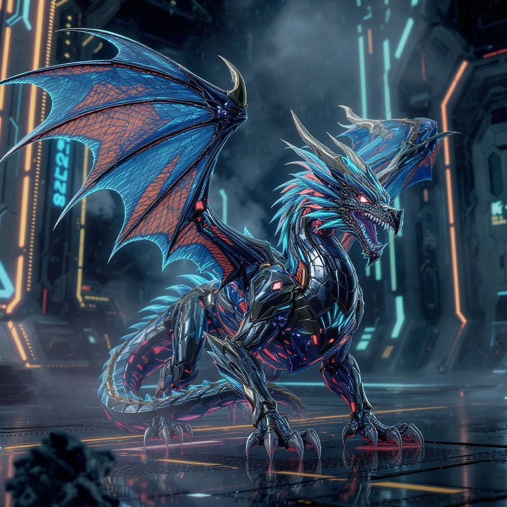 Futuristic metal dragon with hyper-detailed features, set in a high-tech sci-fi environment. Its body gleams with a realistic metallic texture, reflecting neon lights and showcasing fury-filled eyes. The wings combine ice and metal effects, emitting a laser aura. The scene is captured in ultra-realistic 4k resolution, emphasizing the full-body of the dragon with super resolution detailing. The atmosphere is charged with a sense of advanced technology and innovation, framed in an aspect ratio of 9:16.