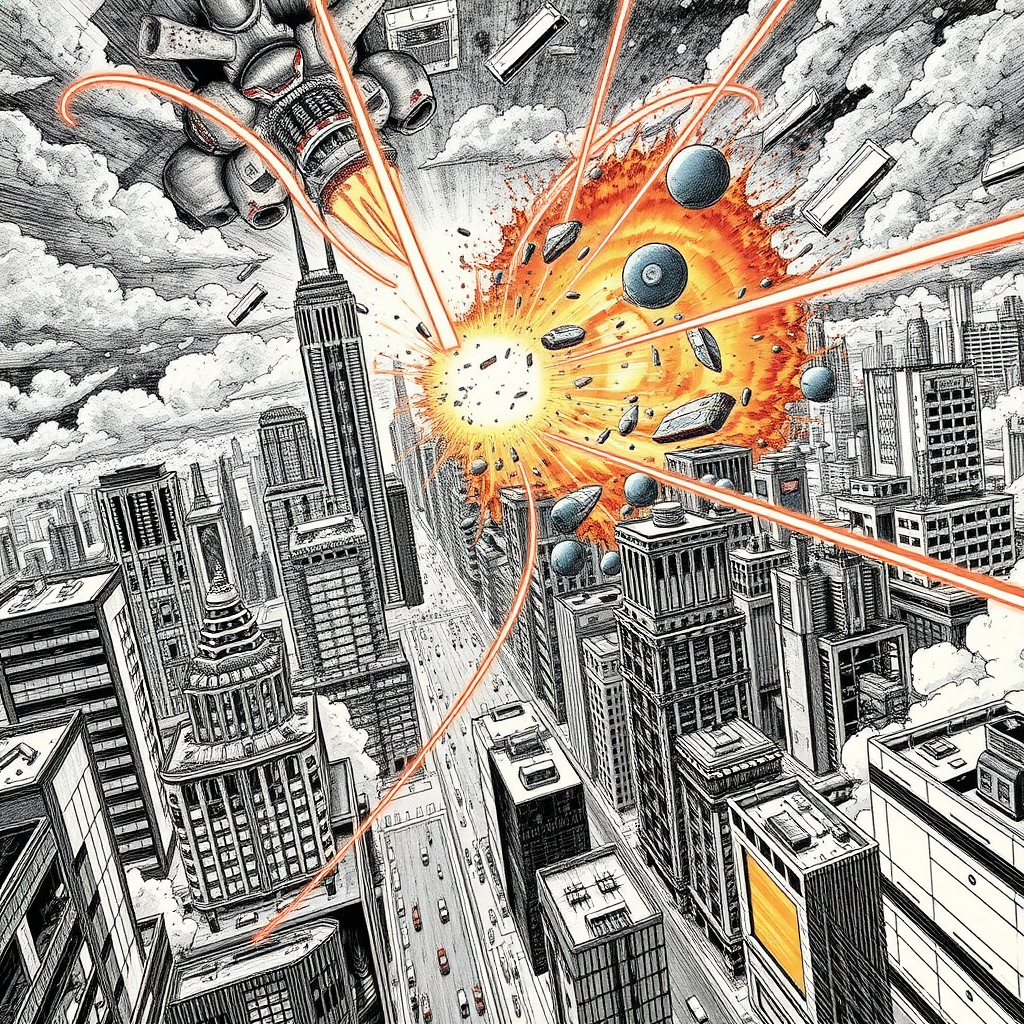 Futuristic metropolis annihilation in the style of Tsutomu Nihei, intricate details, skyward laser assault, obliteration, celestial laser impact, rapid acceleration, blinding flash of light, velocity, anime aesthetic, sketching, high-definition 8K manga art, super-resolution graphics, vertical composition, dynamic cityscape devastation.