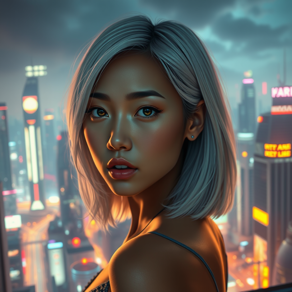 Futuristic metropolis skyline, cyberpunk landscape, ultra-realistic, cinematic lighting, intricate and vivid details, stunning visage, striking Asian girl, warm olive skin, shoulder-length silvery-white hair, vibrant hues, reflective neon glows, dynamic urban backdrop, ethereal ambiance, surreal elements, atmospheric depth.