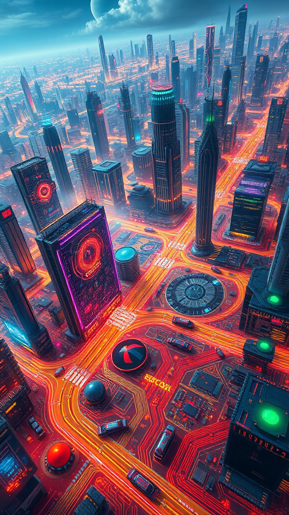Futuristic metropolis sprawled across a vast computer motherboard, with towering circuit skyscrapers, glowing neon traces as streets, and vibrant LED-lit districts bustling with microchip vehicles navigating through intricate silicon valleys.