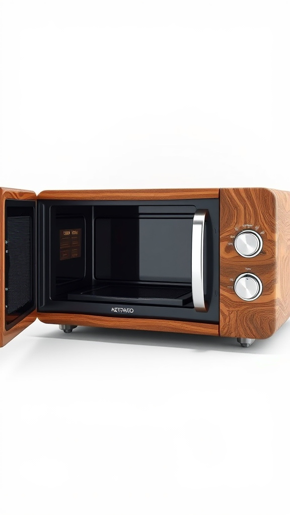 Futuristic microwave crafted from sustainable wood, featuring a modern design with intricate details, styled for artstation as digital art, hyper realistic and hyper detailed, set against a white background, rendered in unreal engine, 8K png resolution, with a subtle depth of field; this microwave embodies eco-friendly technology and innovative aesthetics, seamlessly merging natural materials with advanced functionality in a 1:1 aspect ratio.