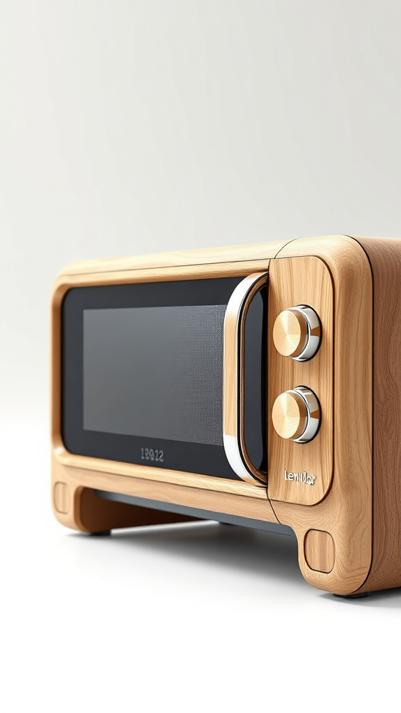 Futuristic microwave crafted from sustainable wood, featuring a modern design with intricate details, presented in an artstation style digital artwork. Hyper-realistic rendering with a white background, created using unreal engine technology. The image is in 8K resolution with a depth of field effect, showcasing a harmonious blend of technology and nature, reflecting eco-friendly innovation. Aspect ratio 1:1.